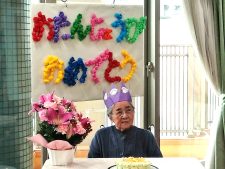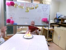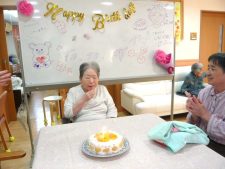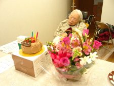 ♪♫ハッピーバースデー♪♫を歌ってお祝いをさせていただきました。お誕生日ケーキのろうそくをフーっと吹き消され「みなさん。今日はありがとうございます。みなさんも長生きしてください。」と、しっかりとご挨拶してくださいました。