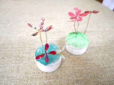 ペットボトルキャップにスポンジを詰めた土台に、針金を花びらに見立てました。