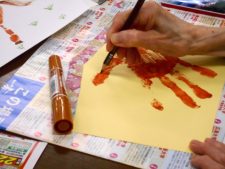 「くすぐったい(≧▽≦)」「初めてじゃけど面白い!」「これからどうなるん?」「馬の顔に見えるかねぇ。」などワイワイ賑やかにお互いで話され、小さな手型や指の節々、しっかりと力強い大きな手の馬の完成です!